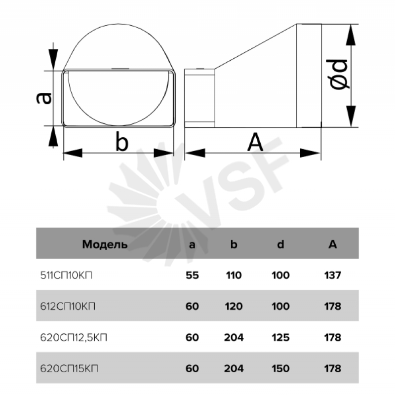 Главная / Фасонные части / Пластиковые / 620СП12,5КП, Соединитель эксцентриковый, плоского воздуховода с круглым пластик, 60х204/D125