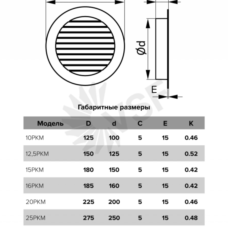 Наружная приточно-вытяжная решетка РКМ монтируется на внешних стенах. Имеет наклонные жалюзи, скрывающие от глаз вентиляционный канал. Решетка изготовлена из алюминиевого сплава, антимоскитная сетка — из нержавеющей стали. Соединяется с воздуховодами через круглый фланец.