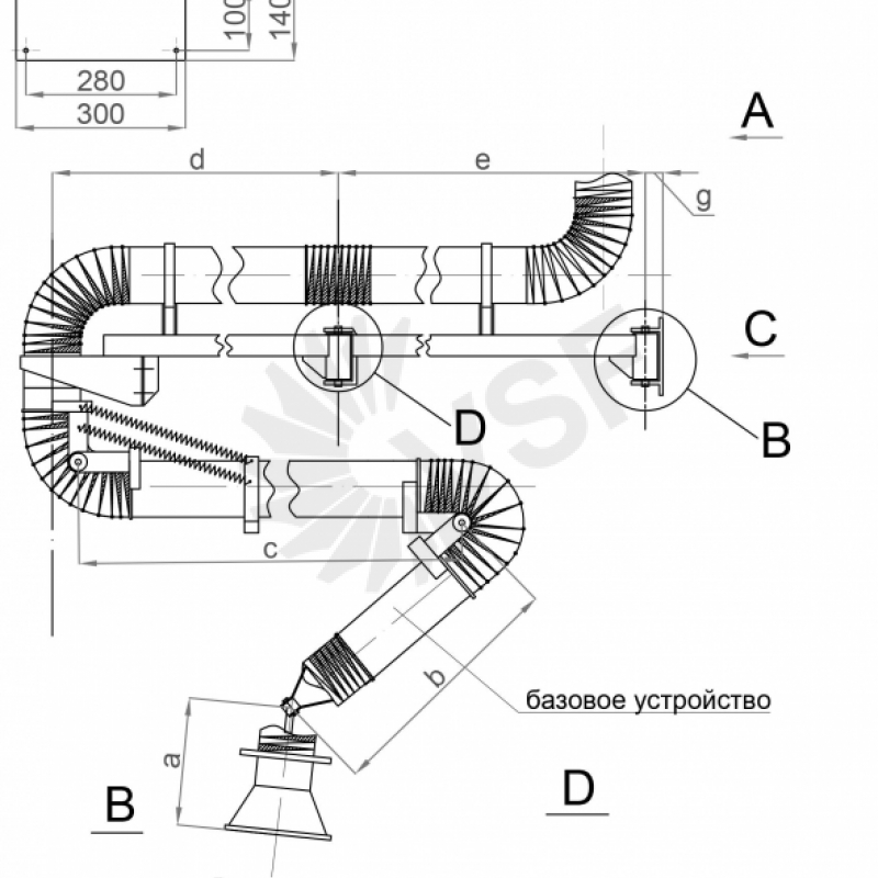 Выпускаемые устройства диаметром воздуховодов 200мм диаметром воронки 320мм рассчитаны на расход воздуха 1600-2000 м3/ч. Устройства «Грум-200» с консолями длиной 2,5(1,5+1)м, 3(2+1)м, 4(2+2)м, что позволяет обеспечивать радиус обслуживания до 8м. Радиус обслуживания зависит от длины используемой консоли и головной части – самофиксирующегося в пространстве устройства радиусом обслуживания 2м (без индекса), 3,2м (с индексом «У»), 4м (с индексом «УМ»). В конструкции устройства предусмотрен кронштейн для крепления к стене или колонне цеха. Поворотный кронштейн консоли обеспечивает ей ход 180о, а закрепленное на ней самофиксирующиеся устройство 200 вращается под консолью на 360о вокруг своей оси. Рекомендуемая высота установки устройства 2-2,25м. Устройство верхнего подключения (под опорой). Для подключения устройства к вентиляционной сети, вентилятору или фильтру в комплекте предусмотрен гибкий воздуховод (гофрированный шланг) длиной 0,7м.